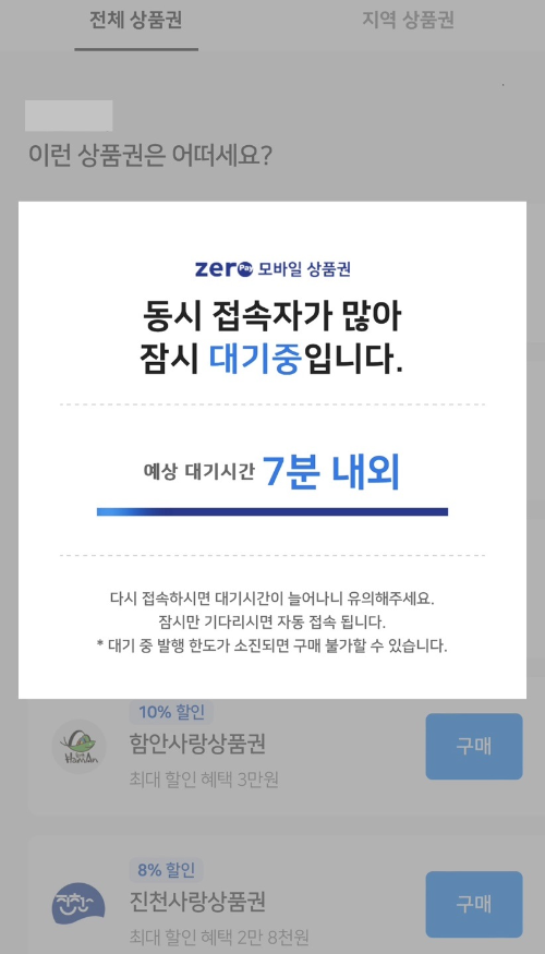 그럼 여러가지 상품권이 보이실 텐데요. 그 중에서 대한민국수산대전 상품권을 클릭하세요. 그런데 상품권도 예산이 한정되어 있는 터라 선착순 구매방식이랍니다. 티켓팅 하듯이 시간 딱 맞춰 바로 들어가셔야 해요. 그렇지 않으면 아래와 같이 대기 시간과 함께 구매 실패 가능성이 있답니다.