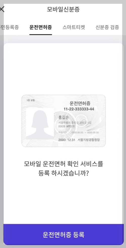 4) 주민등록증, 운전면허증 총 2가지 모바일 신분증과 비행기 티켓을 스마트 티켓 형태로 등록할 수 있는데요. 이번에는 주민등록증을 먼저 등록해 보겠습니다.