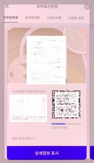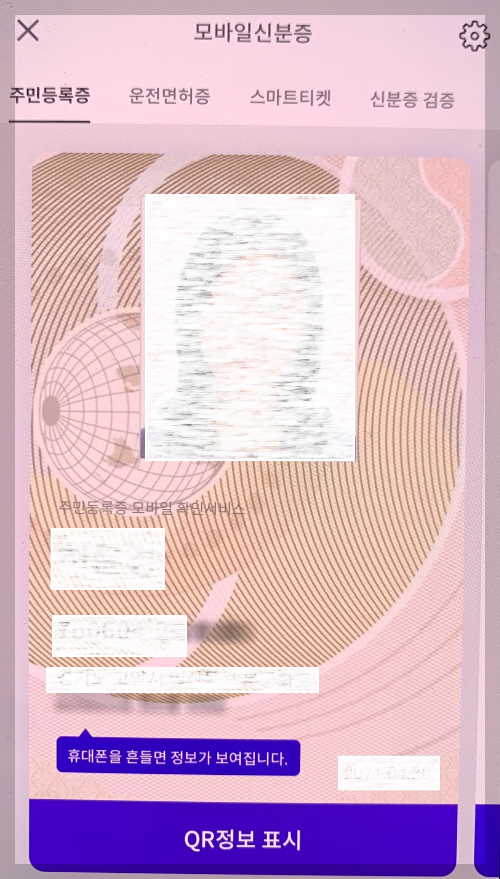 6) 여기까지 진행하시면 아래와 같이 주민등록증 화면이 보이실 거예요. 이제부터는 본인 확인이 필요할 때 아래 QR코드 화면을 보여주시면 됩니다. (화면 캡쳐가 안 되다 보니 화질이 다소 흐릿합니다) 정말 간단하죠?