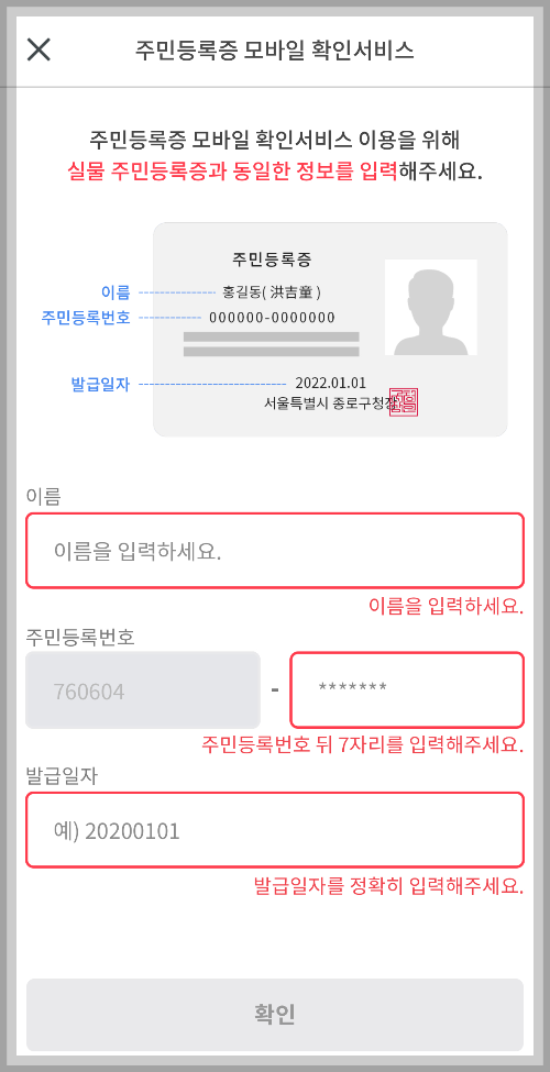 5) 주민등록증 모바일 등록 시 실물카드는 따로 필요 없습니다. 이용동의 → 이름 / 주민번호 / 주민등록증 발급일자 입력 → 안면 인증 등록하시면 끝!