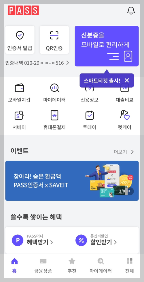 1) 스마트폰에 패스(PASS) 앱을 먼저 설치해주세요. 패스 앱은 각 통신사별로 앱이 별도로 있으니, 아래에서 자신이 사용 중인 통신사와 기종에 맞게 먼저 다운받으시면 됩니다.