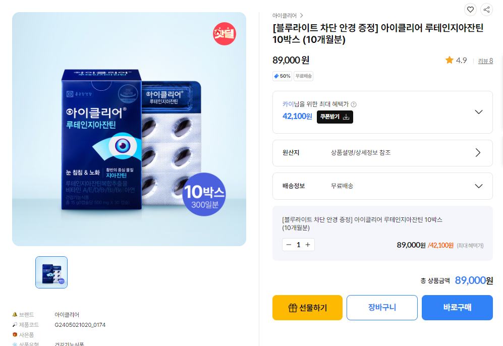 이렇게 반값 쿠폰, 5천원 적립금까지 사용해서 저는 매일 꾸준히 챙겨먹는 루테인 지아잔틴을 구매했는데요. 이거 정말 찐이네요. 10개월분 정가 89,000원 제품을 39,500원에 구입했으니까요. 이거야말로 최고의 가성비 쇼핑이네요!