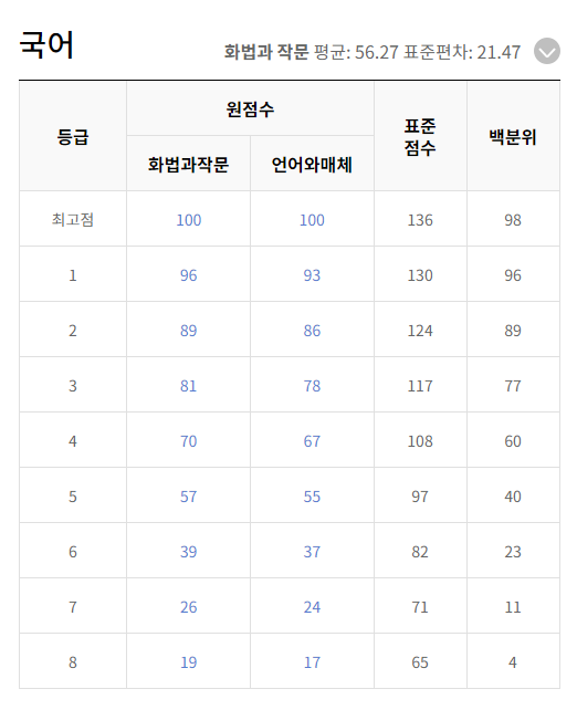 이번 5월 모의고사는 수학 등급컷이 다른 과목에 비해 낮게 시작합니다. 확률과 통계 1등급 컷점수가 77점이네요. 국어는 화법과 작문이 96점, 상당히 높습니다. 영어와 한국사는 아직 등급컷이 발표되지 않았습니다.